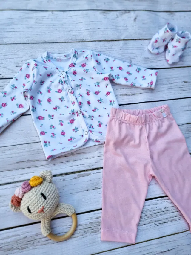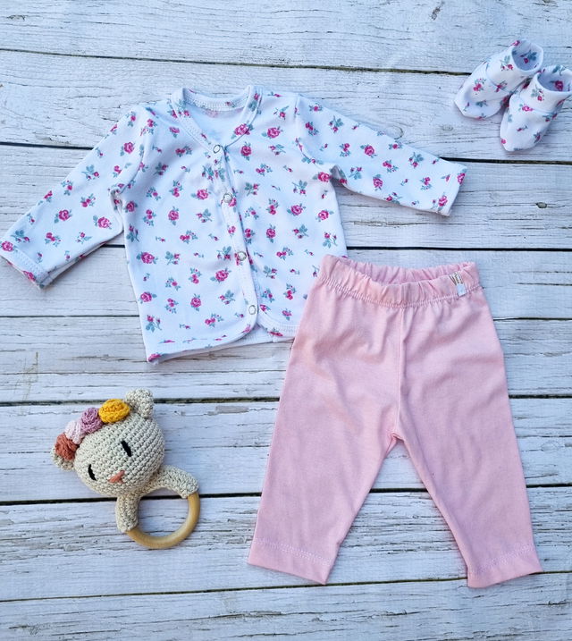 Confeccionado en algodón. Con broches de presión. Está compuesto por la camperita Y el pantalón. Si es para regalito, podes complementarlo con un mordillo, un muñeco de apego o una manta